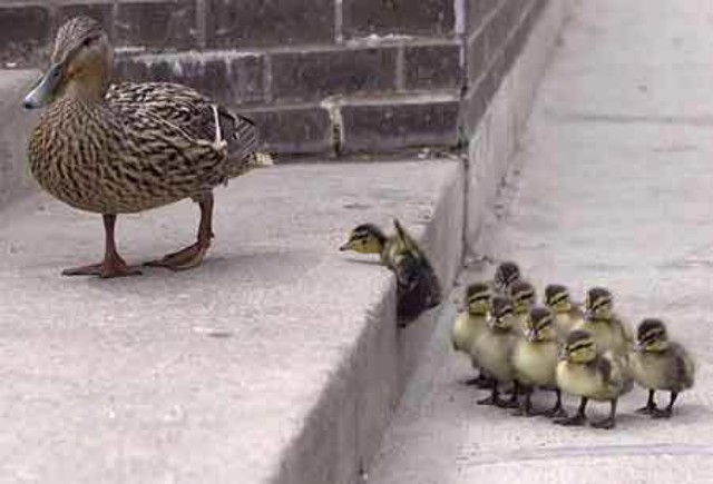 ) una patita con sus patitos cruzando la autopista.