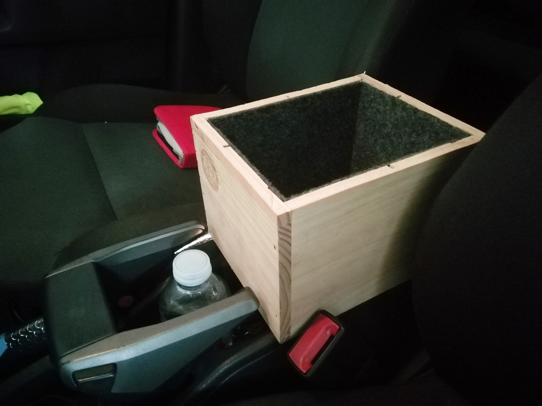 Partimos de una caja de madera de vino de Ribera del Duero, por supuesto. Cortar, clavar y enmoquetar para evitar ruiditos