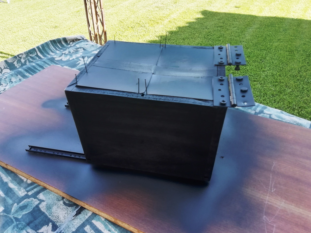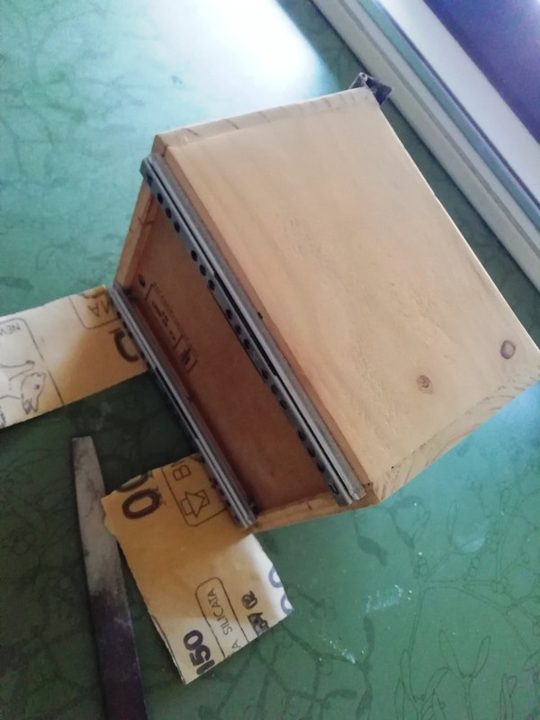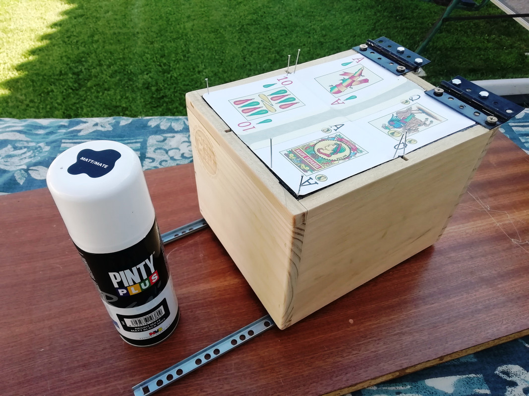 Las ponemos en su sitio. Bisagras, unas que había por ahí, un poco duras mejor así la tapa se sujeta. Lima para las esquinas, lija para toda la caja y pintura en spray, negro mate.