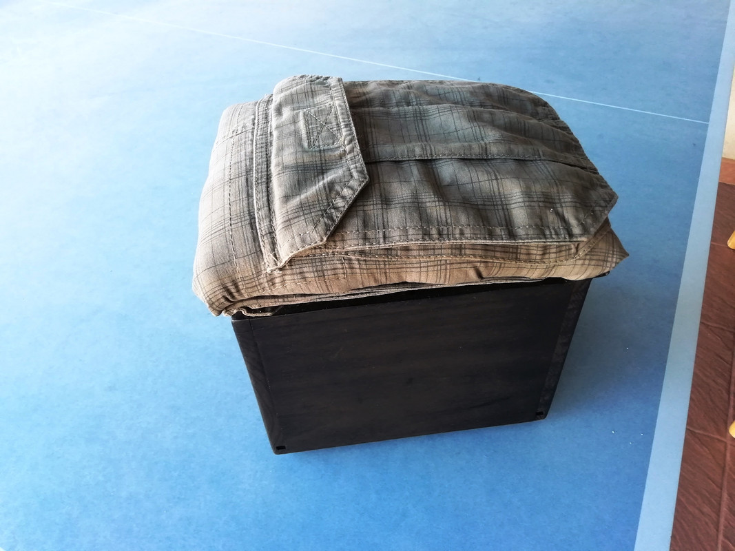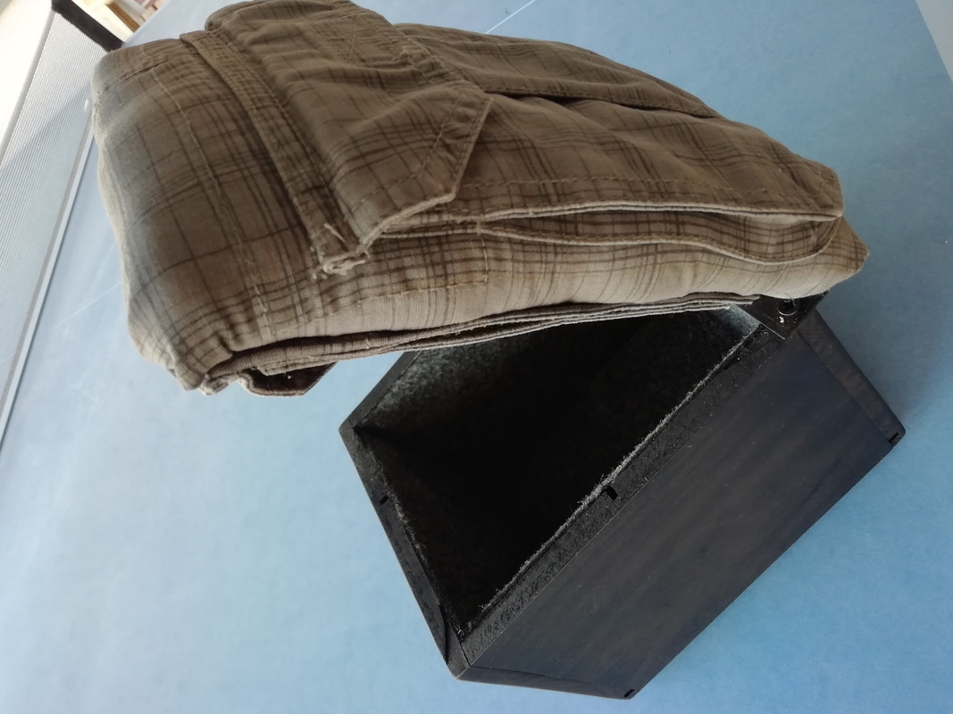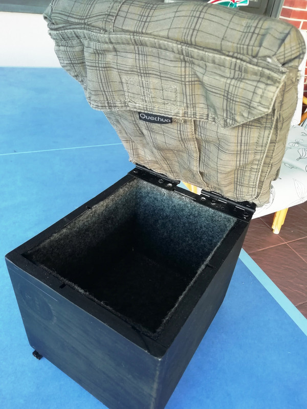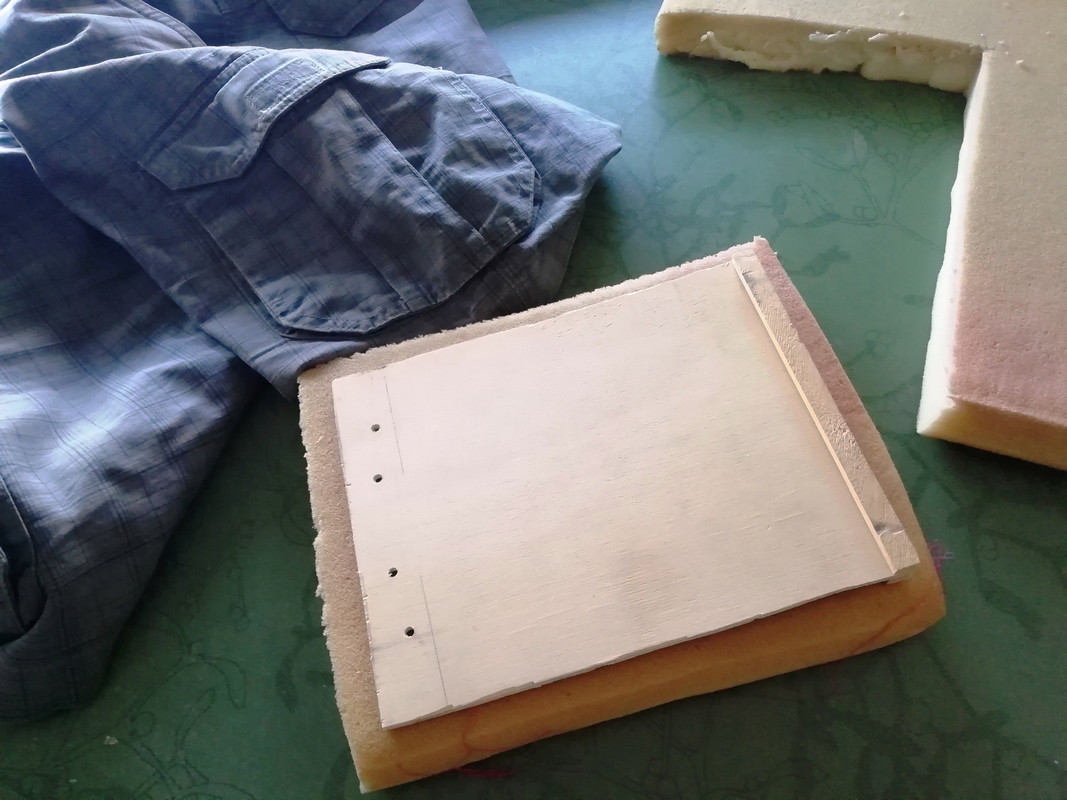 Vamos con la tapa. Agujereo y ya meto las tuercas debajo de un cacho de espuma. Un pantalón que ya no me vale