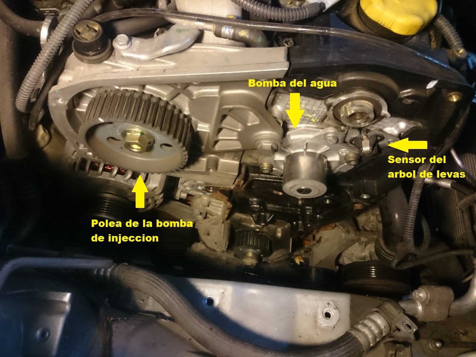 Visualmente la pérdida se aprecia entre el enfriador de aceite y el alternador... He desconectado el enfriador y lo he puenteado, enfriador descartado..creo recordar que la bomba de agua se encuentra accionada por correa de distribución y se encuentra en el lado derecho (mirando la correa de distribucion) bajo la polea del árbol de levas... Por lo que no creo que sea de bomba de agua